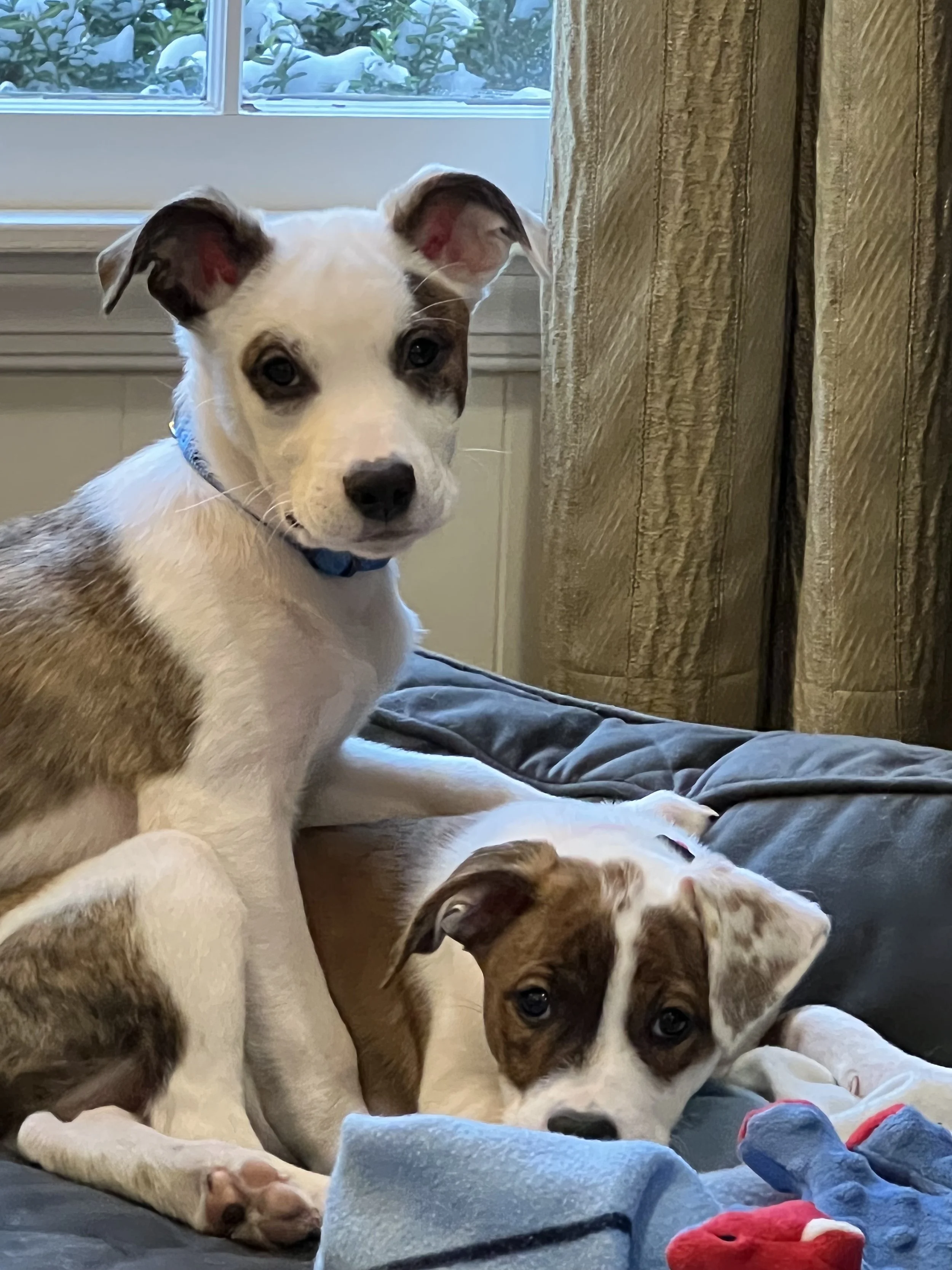 /We adopted two puppies from the local shelter this Christmas. They’re mutts, to be sure, with spots and stripes that, at first, were the only ways we could tell them apart. Brother and sister, she is more reserved, but will destroy any book or pair of glasses I leave within her reach. He is bulkier and a bit of a bully who will try to take away anything his sister finds.
