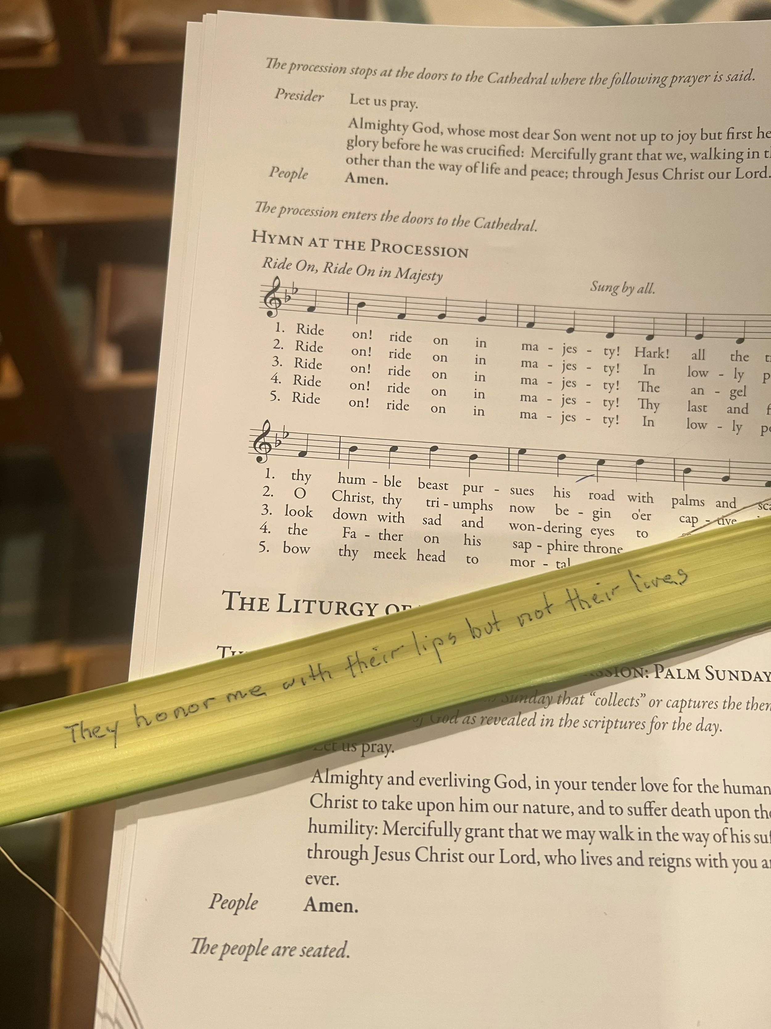 Unfortunately, the planners of the service were equally excited by the day and included every liturgical trick in the book. Not only did the service cram the events of Holy Week in an hour and fifteen minutes, a Dixieland band played Just a closer walk with thee as the shivering participants stood outside waiting for the service to begin. Palms were blessed, incense lit, and someone instructed us on the “proper way” to wave our palms in the air. If we missed the day’s significance, the sound of the organ make it perfectly clear.