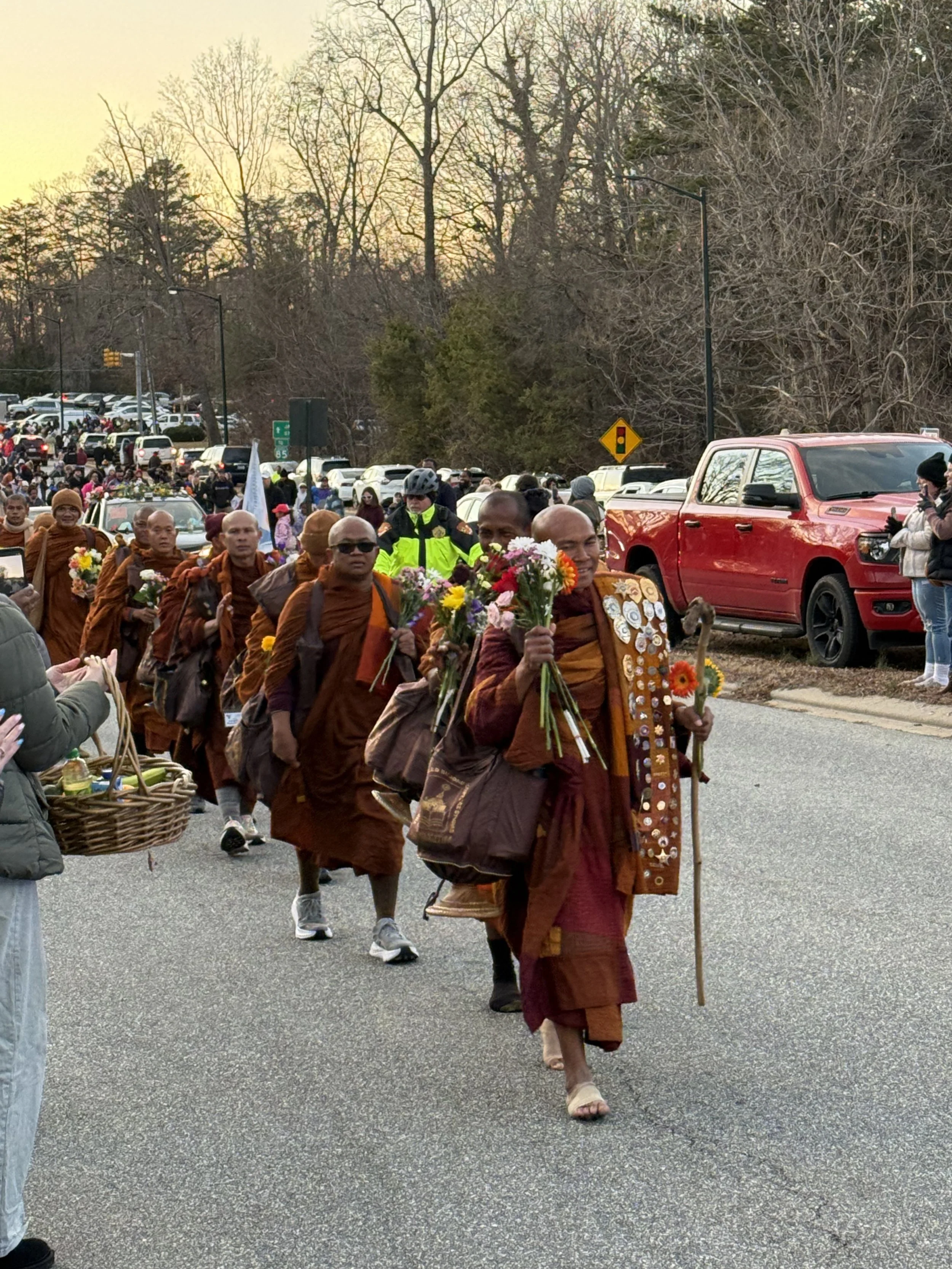 /Cars were lined up for miles, others pulled onto the median and on the sidewalks lining the route of the Tibetan monks. It was a scene unlike any I’ve ever seen. Thousands of people gathering in frigid temperature to see these pilgrims on their way to Washington. Then came the greatest surprise: silence. Despite the countless people lining their route, it was quiet - like a cathedral, temple, or other sacred space. (Yes, some felt the need to speak to friends on their phones (on speaker mode) but they were the exception.)